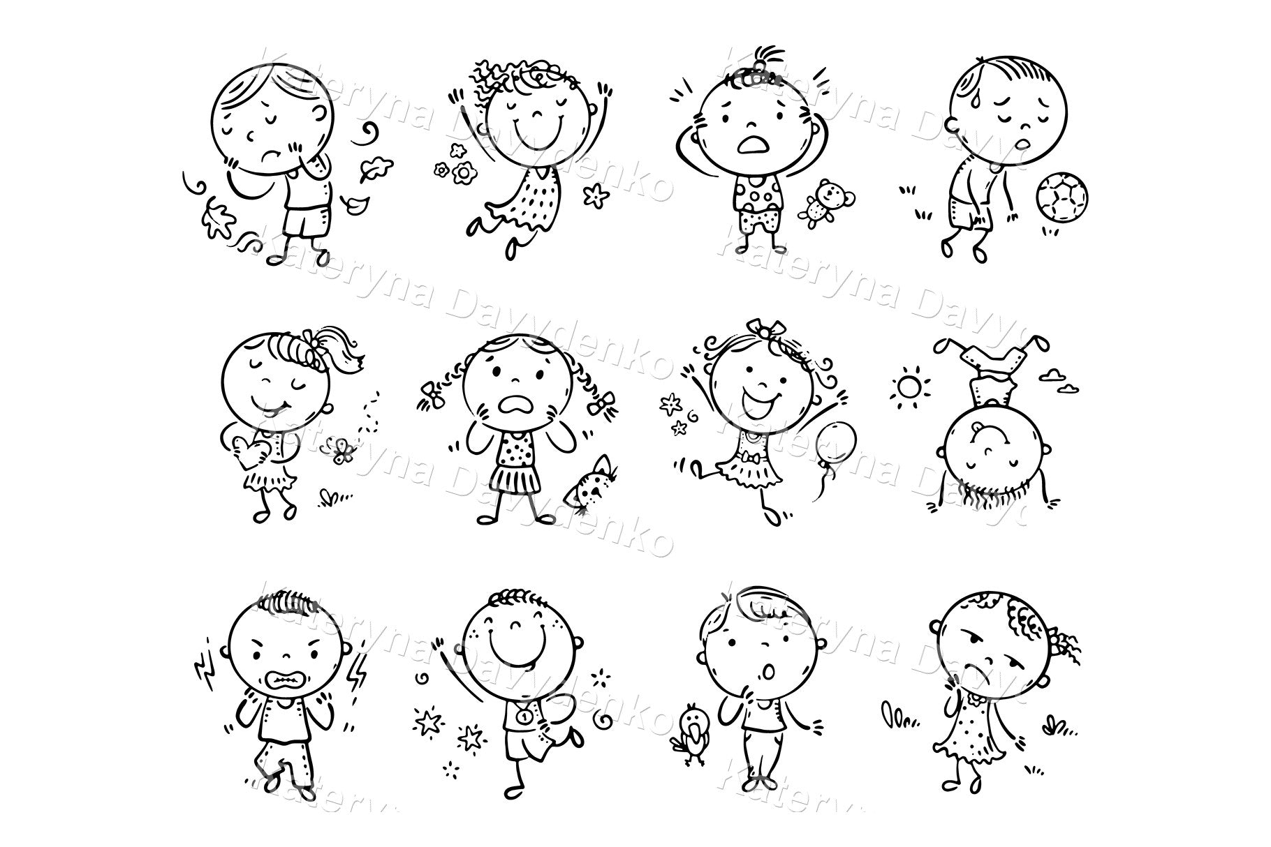 Cute hand-drawn children showing emotions, perfect for preschool visuals or teaching resources. High quality, commercial use PNG file, ready-to-use.