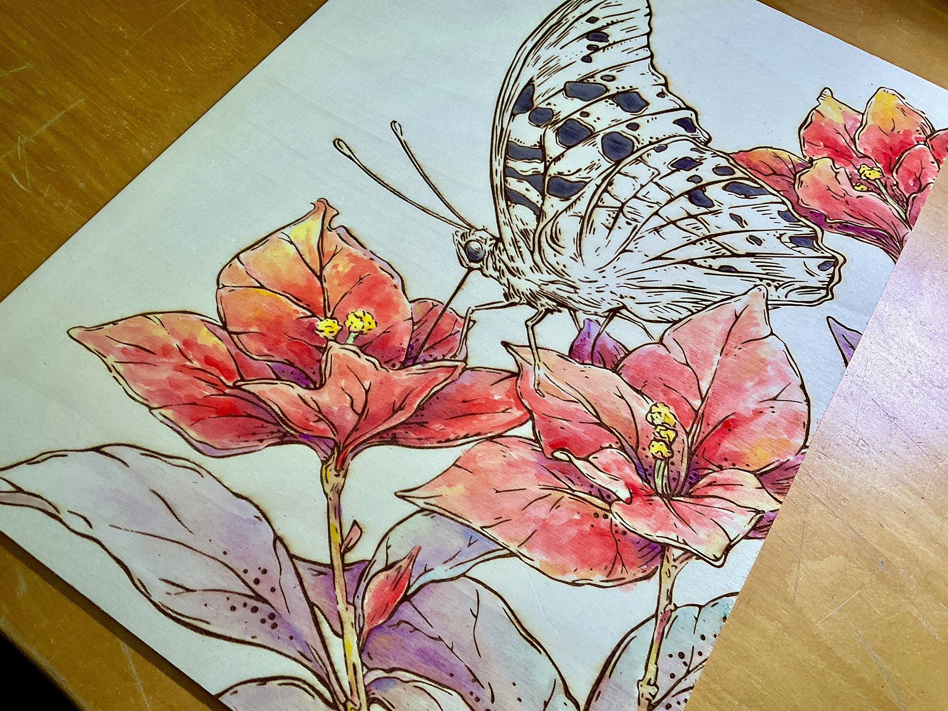 Elegant butterfly and flowers design for laser engraving and coloring. Create a stunning botanical wall art piece by burning the outlines and painting them with kids or on your own. Perfect for DIY decor, creative learning and unique handmade gifts. Includes SVG, DXF, EPS, AI files ready for Glowforge, xTool, OMTech and other laser cutters.
