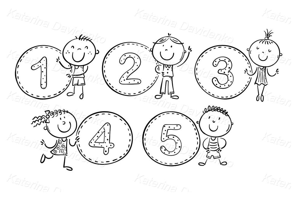 Happy kids and large numbers 1–5 in playful doodle style, black and white—great for learning games, presentations, and printables. Commercial use, PNG files.