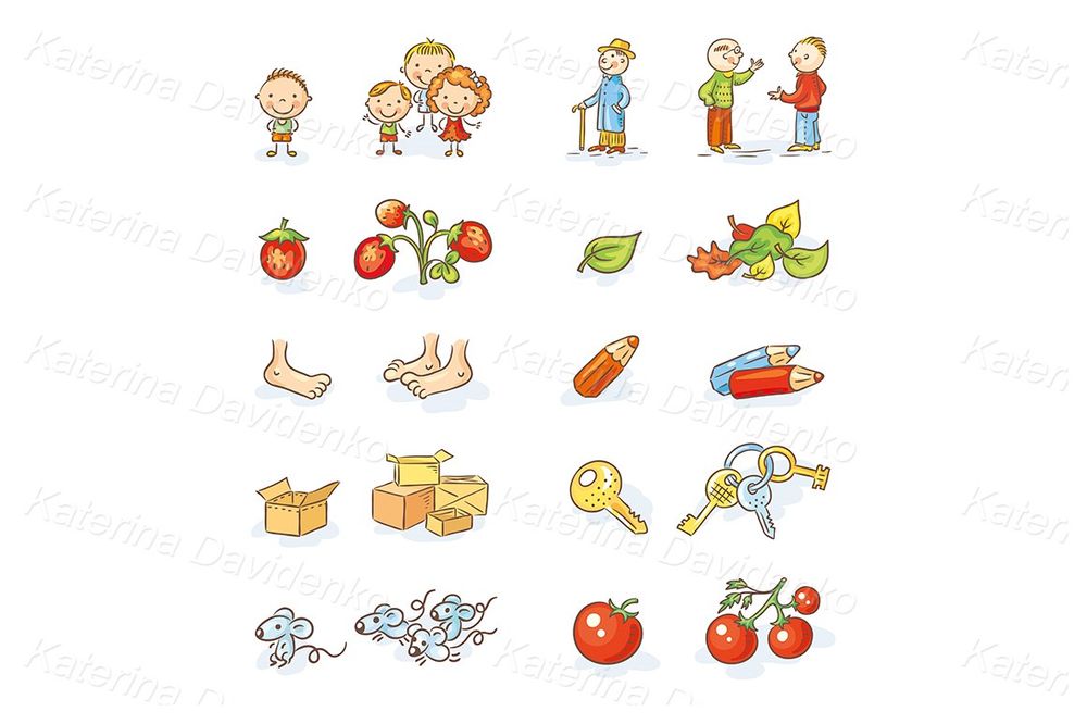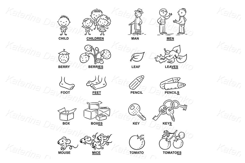 Colorful grammar chart showing singular and plural nouns. Ideal for ESL lessons, classroom posters, flashcards, and home learning activities. Premium vector, instant download.
