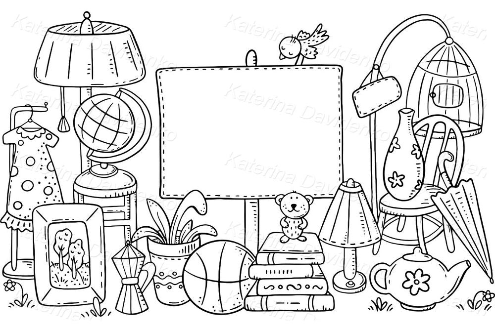 Yard sale items like lamps, books, globe, and toys. Fun clipart for signs, invites, or labels. Instant download, high quality.